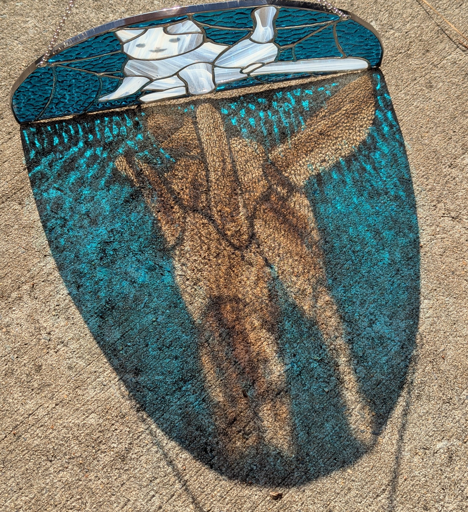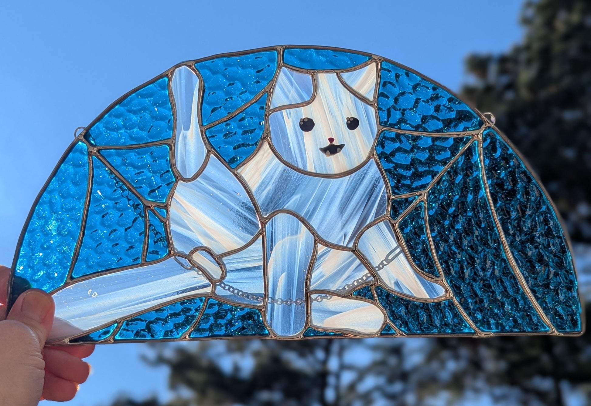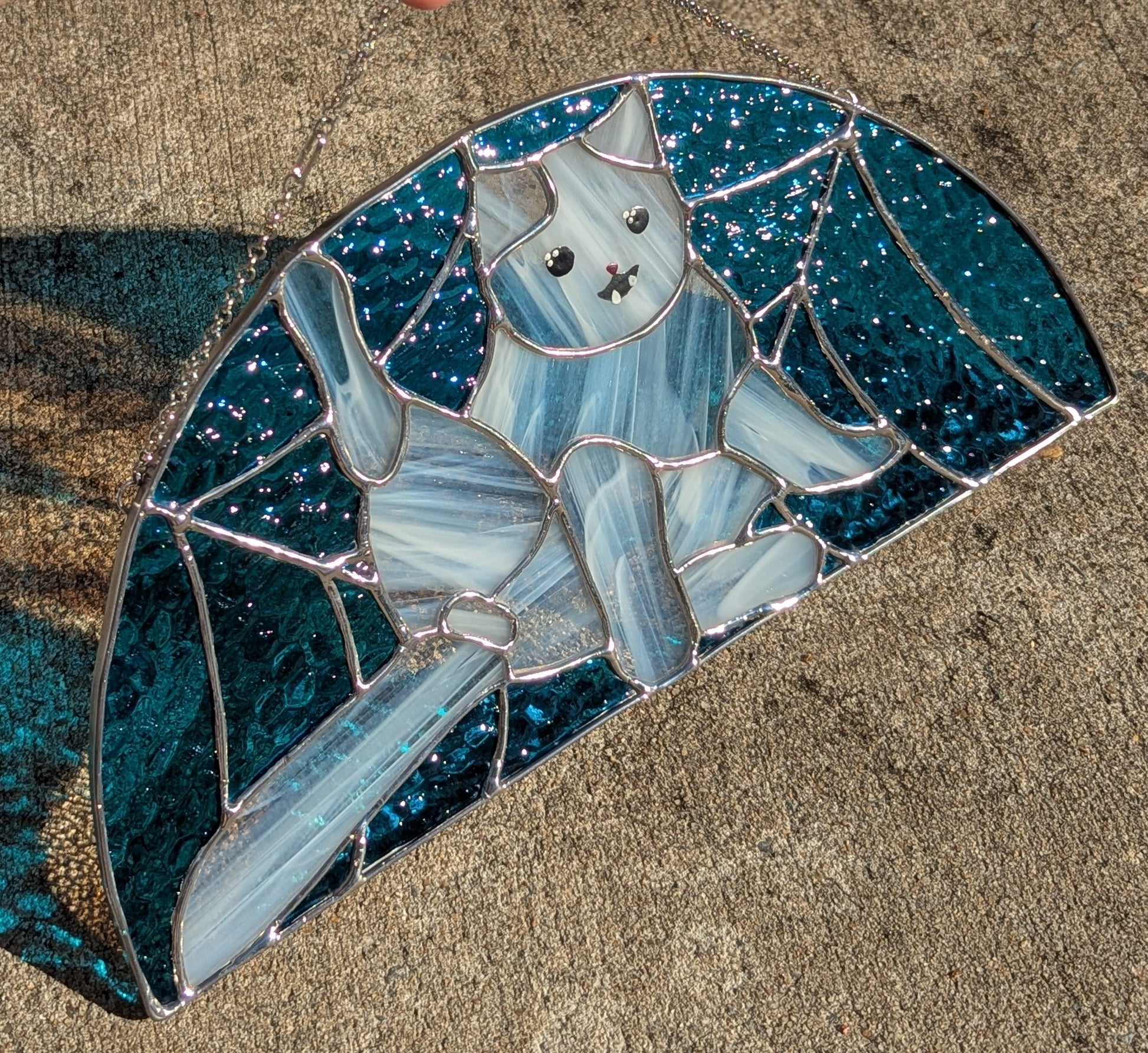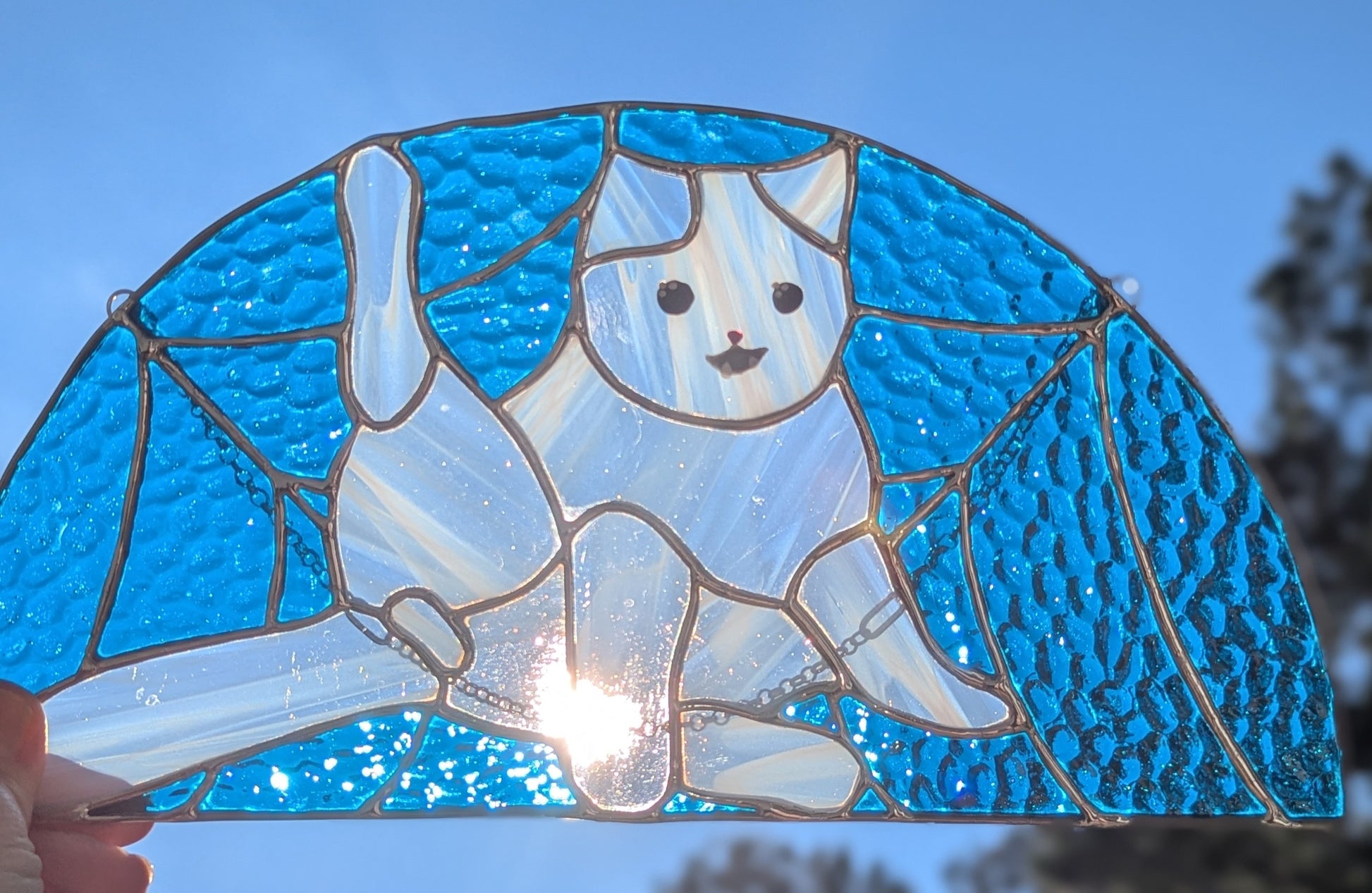 Stained glass cat, featuring a classic position all cat owners are familiar with. Comes ready to hang in your window, for the world to appreciate with you!