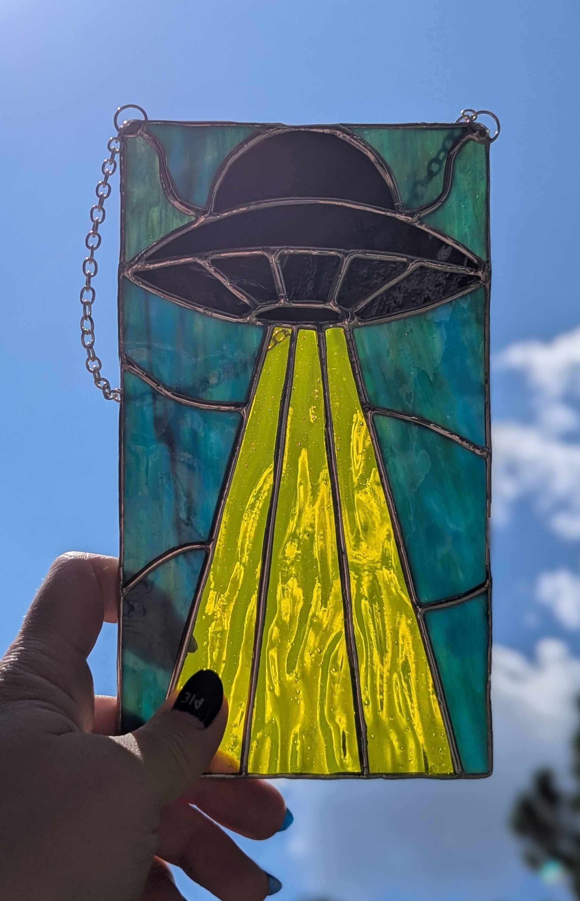 One day, we will meet them! For now, capture the whimsy of meeting outer space in a small window panel with this iridescent black spaceship. All the fun of Aliens without all the worry of a probing!